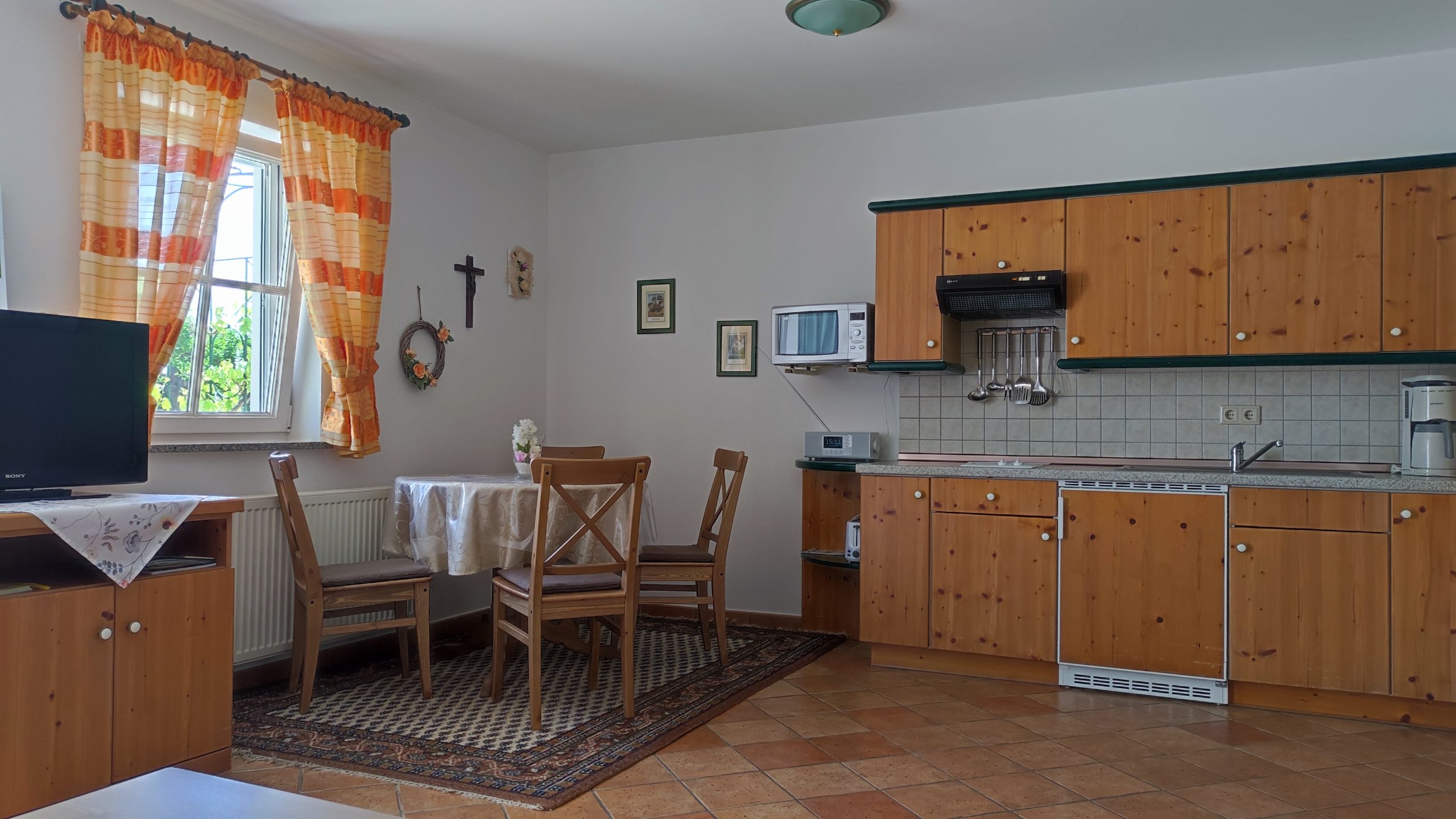 Eine voll ausgestattete Küche enthält alles was Sie zur Selbstversorgung brauchen. Kochfeld, Kaffeemaschine, Wasserkocher, Toaster, Mikrowelle, Kühlschrank mit Gefrierfach.